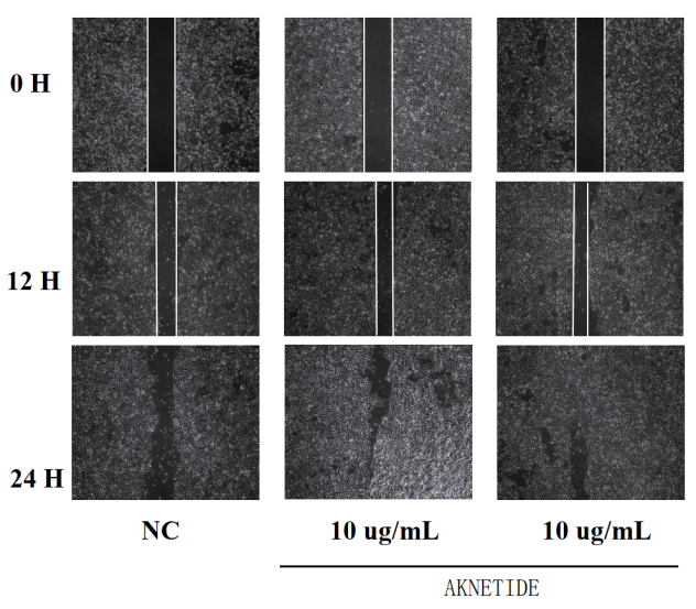 In a scratch assay upon CaHaT celllines, 10 ppm AKNETIDE led to 12-13% healing rate in 12 hours, and 28-29% healing rate in 24 hours